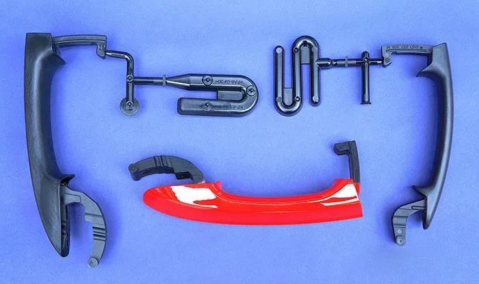這些門把手采用30%玻璃纖維增強PA6制成,外殼采用PC/ABS混合物制成,背后的結構組件采用30%玻璃纖維增強PP制成。